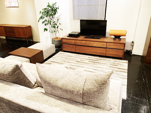 こちらのシーンは白系で合わせてみました。ラグとソファは面積を占める