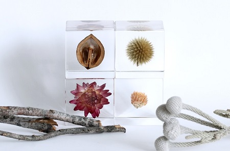 こちらは「植物の美しいかたち」をコンセプトに、植物の美しい瞬間をとらえて、透明のアクリルキューブに封入しています。