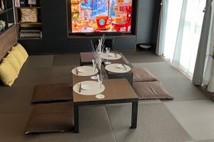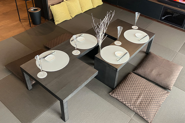 1/2テーブルは、畳の色合いとなじむ点に加え、用途に合わせて形を変えられる柔軟さが魅力です。さらに、重量が軽く女性でも簡単に移動できる扱いやすさも、選定の大きな理由となりました。バーカウンターにはHAYのリボルバーハイスツールを採用。