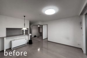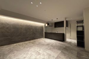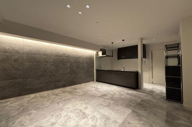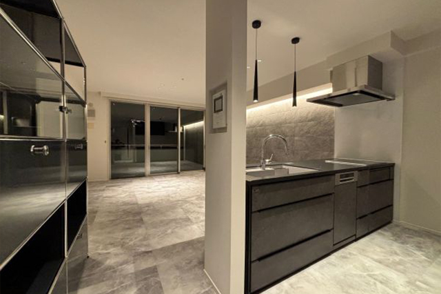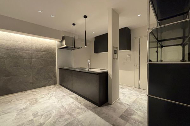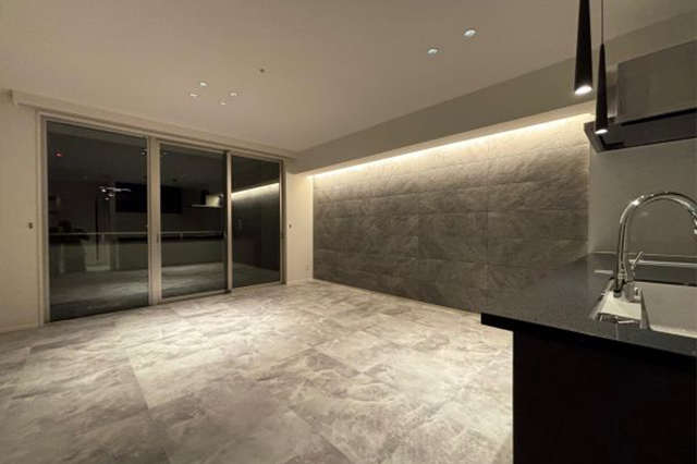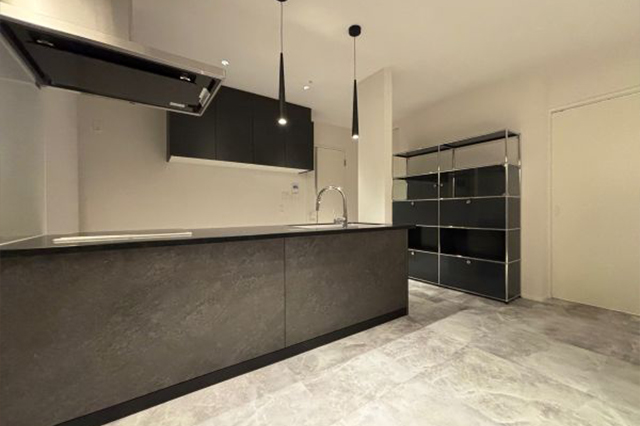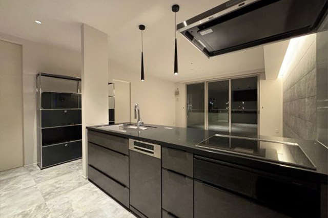 シックなグレーのグラデーションに、壁面は柔らかなオフホワイトで統一。大きなアイテムをダークグレーでまとめることで、空間に落ち着きとラグジュアリー感を演出しています。LD壁の一面には大判で凹凸のあるエコカラットを施工し、間接照明がその表情を美しく照らし出すことで、より上質で穏やかな雰囲気を生み出しています。さらに、LDKのどこからでも目に入る位置には、飾り棚と実用的な収納を兼ね備えた USMハラーキャビネット を配置。見せる楽しみ・飾る喜びが日常に彩りを与え、暮らしをより豊かにしてくれます。