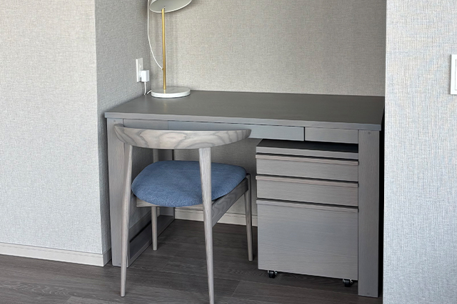 - キメチェア(別注グレー塗装)、リプリーデスク(別注グレー塗装)、リプリーデスクワゴン(別注グレー塗装)、リニエナイトテーブル(グレー塗装)、yuhテーブルライト、MODEL 314